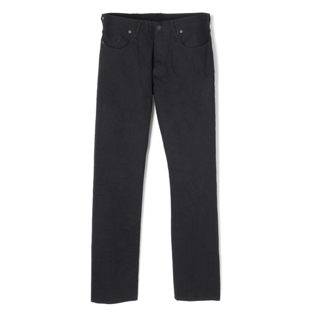 タテヨコともにブラックに染め上げた糸で織り上げたオリジナルの生機デニムを採用しています。もちろん力織機によるセルビッジ付きで、ブラックデニムながらクラシカルな風合いを持った生地になっています。洗濯後後レングスは2インチ、ウエストは1インチほど縮みが生じます。