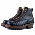 6インチ丈のレーストウ仕様にブラックの「カイマンレザー」と「クロムエキセルレザー」をツートン仕様で合わせることで、オールブラックでありながらラグジュアリーかつ茶芯の経年変化を楽しめるブーツに仕上げた。